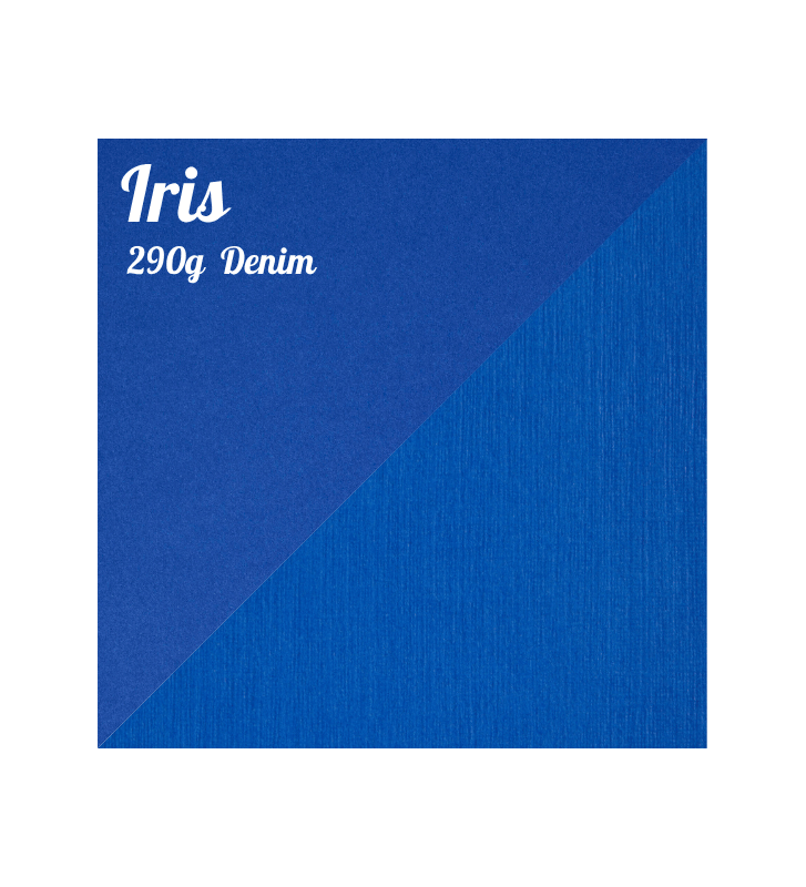 Couleur Iris 290 g/m², disponible au format A4 ou A3, une face lisse et une face texturée "Denim"